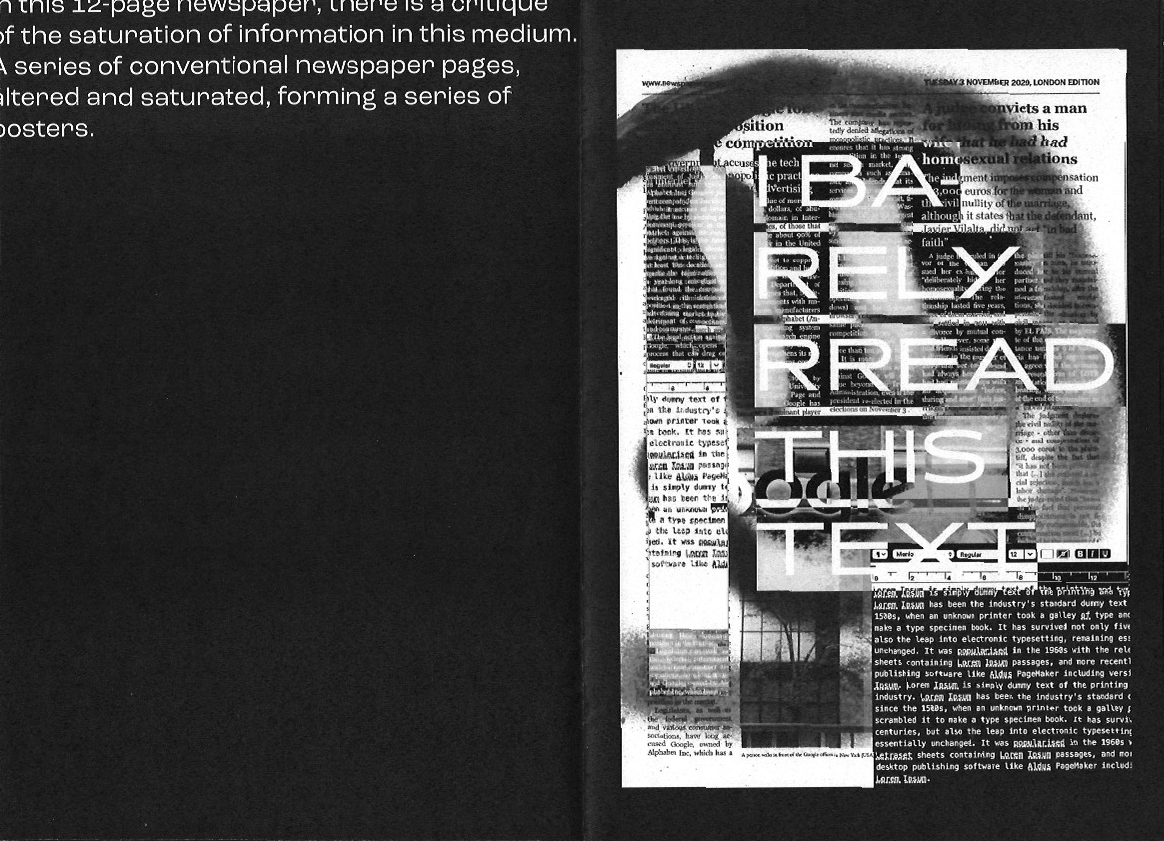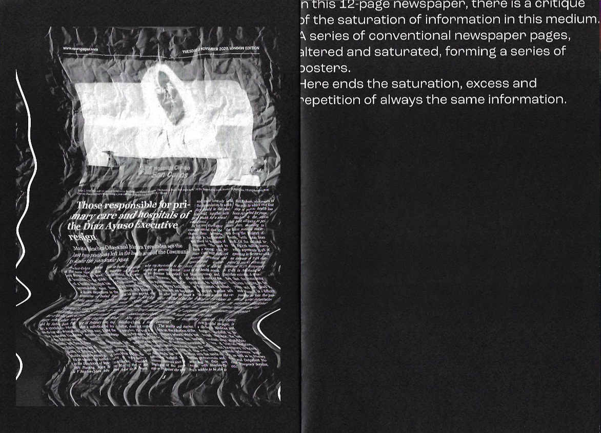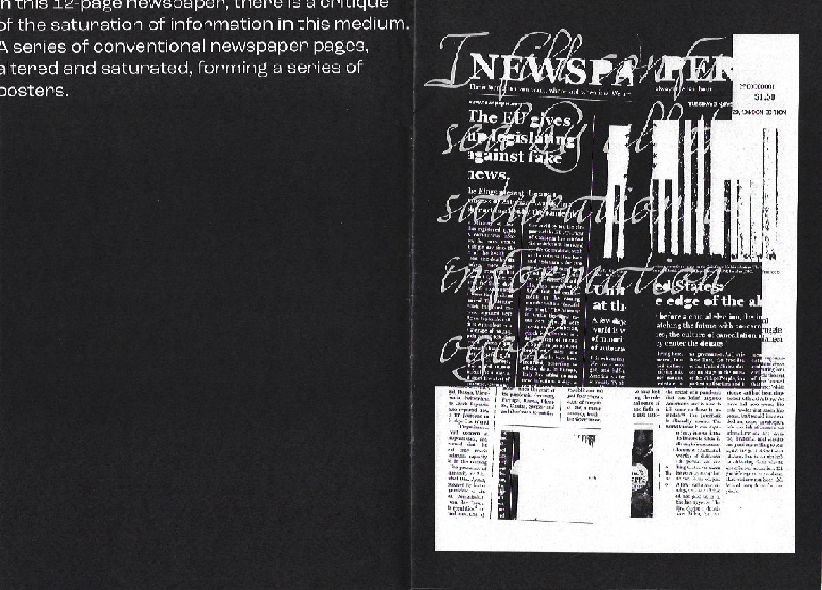 Layout and content creation of a newspaper. Criticism of the excess and selection of information from newspapers, through typographic and experimental games with different techniques.